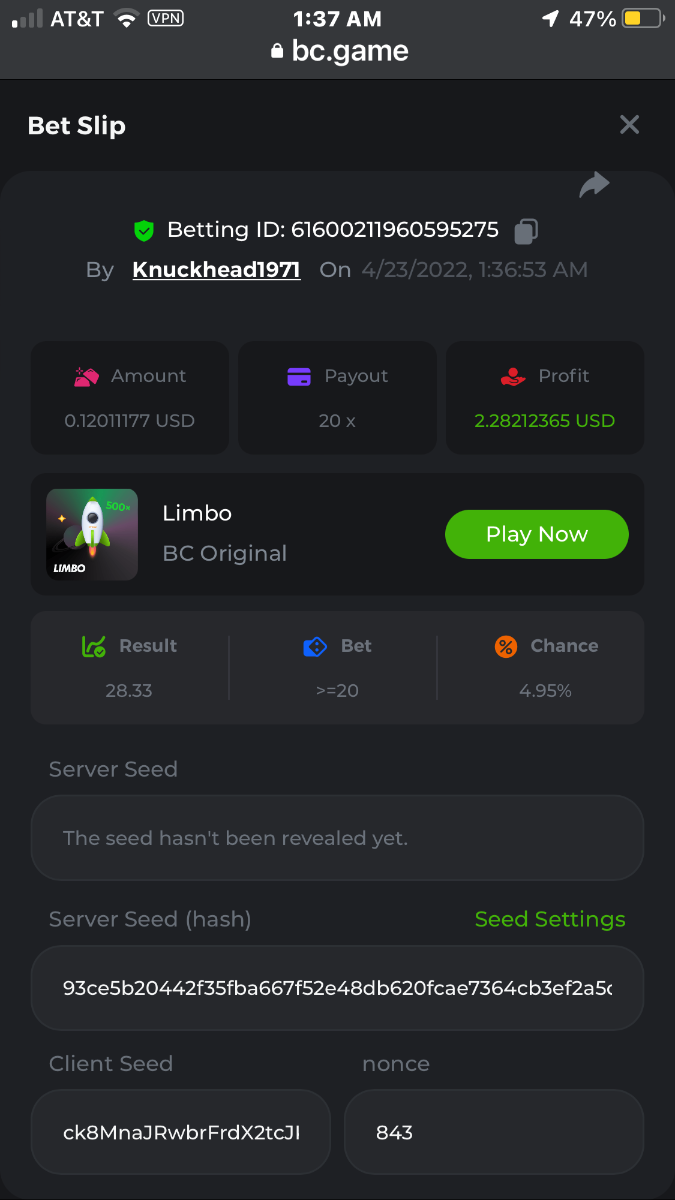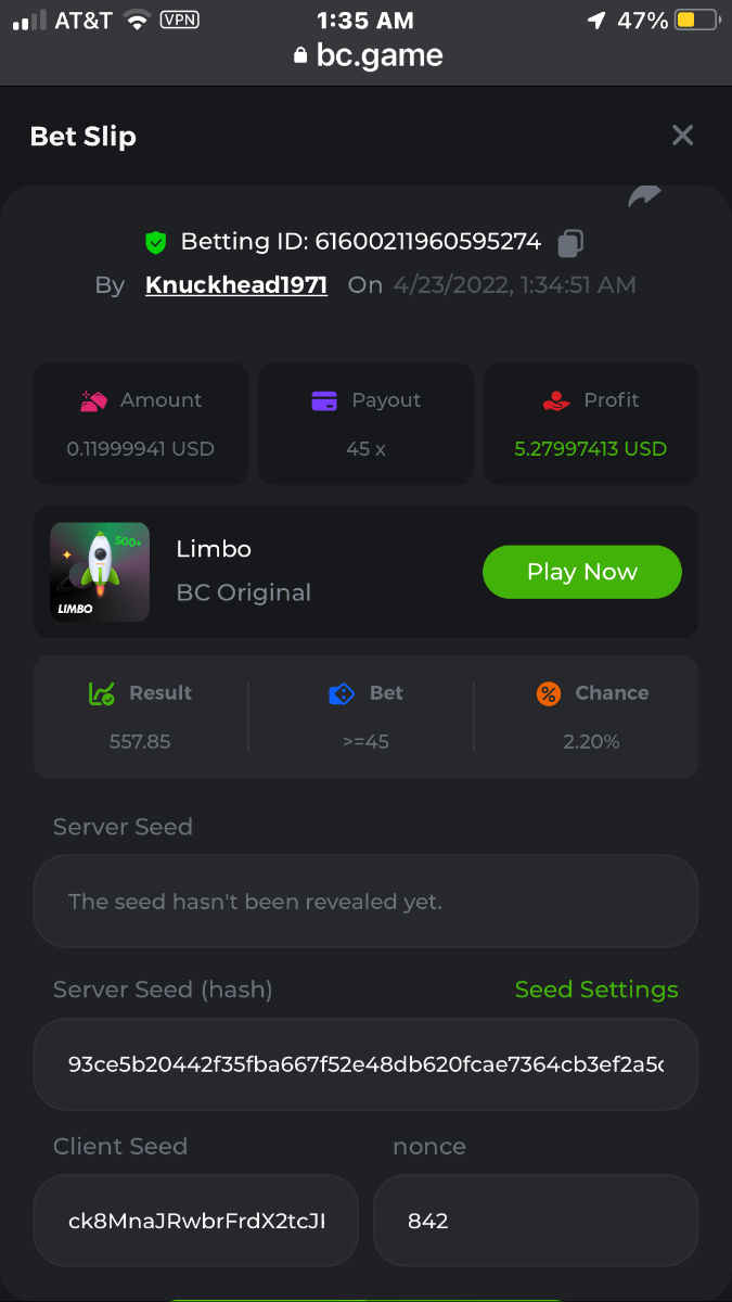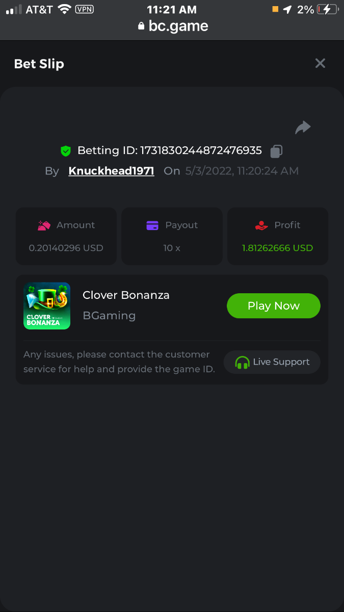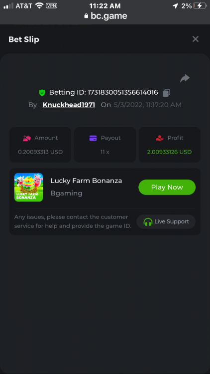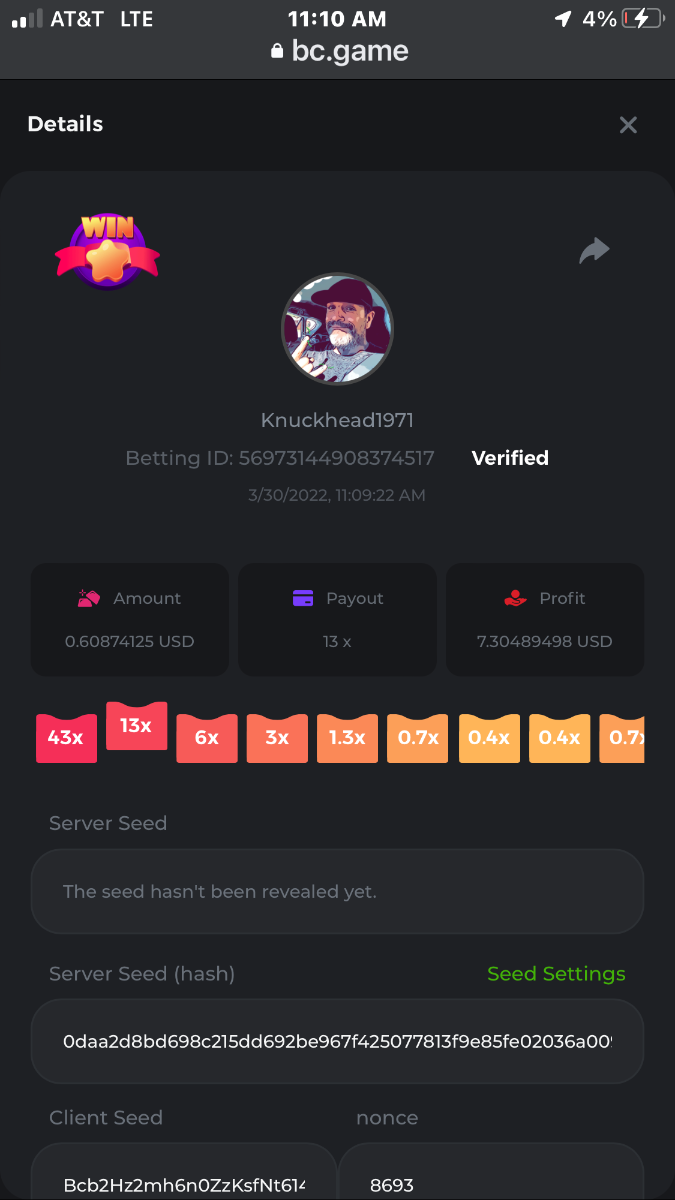 7. Grey https://bc.game/sd/?sd=10JQ3N5PEGGS2B purple https://bc.game/sd/?sd=10JQ3SOXMDQ5G3 orange https://bc.game/sd/?sd=10JQ46HQF3BBIR green https://bc.game/sd/?sd=10JQ5MRG4GET5F All wins are in order verified by time and date in succession grey first and green last bet was .00002596 BTC = $1.00 USD
