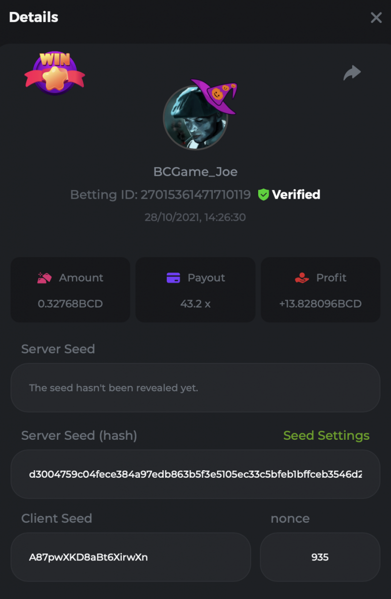 7. HALLOWEEN SLOT BATTLE Starts: 26, October 14:00 GMT Ends: 2, November 14:00 GMT Welcome back, to celebrate this Halloween season we have a spook-filled BGaming Halloween slot battle for you this week, with a total prize pool of $4,000! What's the Challenge? BGaming Multiplier battle - Get the highest multiplier on any of the 4 BGaming slots below Lucky Dama Muerta Spin & Spell Candy Monsta Fruit Million - Halloween Edition 1 prize per slot, awarded to the person with the highest multiplier on each of the 4 games above Each winner must be unique - meaning 4 prizes given to 4 separate people - you cannot win more than one prize! In the event that someone does post winning entries for more than 1 slot, the entry with the highest multiplier will be valid - all other entries will be disregarded and the prize will be awarded to the next valid entry. Minimum VIP Tier Must be VIP4 or higher in order to enter this challenge. Minimum Bet Size Lucky Dama Muerta - $0.20 Spin & Spell - $0.20 Candy Monsta - $0.20 Fruit Million - Halloween Edition - $0.20 Eligible Coins All coins are eligible (excluding JB) Available Prizes Lucky Dama Muerta - Highest Multi......$1,000 Spin & Spell - Highest Multi.....$1,000 Candy Monsta - Highest Multi....$1,000 Fruit Million - Highest Multi......$1,000 How to Enter To enter, copy the bet ID of the bet you'd like to submit Once you've copied it, post it as a reply to this thread like so: Betting ID: 1708854428417660423 In the same post, upload a screenshot of your win by clicking the game ID WITH VIEW IN USD mode ENABLED (accessible at the bottom of dropdown menu for your wallet up top. This way, we can ensure that your bet indeed met the minimum requirement at the time of placing it: