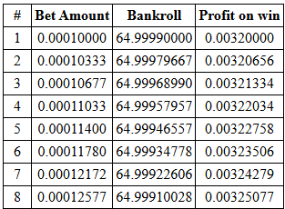 1. Hola a todos, se que puede parecer no tener mucho sentido lo que puse en el titulo porque cuando perdemos un balance nos podemos quedar sin con que jugar hasta que hagamos un deposito o juntemos con que jugar, ya sea con los cocos y/o las lluvias, pero acá les explicare en detalle como se le puede sacar provecho a las perdidas de balance para llegar a tener un saldo interesante con el cual jugar, que sea difícil perderlo o también si queremos lo podemos retirar. Para empezar les digo que todo lo que les mostraré es basado en el multiplicador 33x que es de los que suelo usar para jugar el limbo y el dice en sus 3 variantes que nos ofrece BC. A continuación les muestro una captura de pantalla de una calculadora que utilizo para mis apuestas, como pueden ver la calculadora me esta diciendo que con un balance de 65 usd, haciendo una apuesta con lo mínimo que permite BC que es 0.0001 y aplicando un incremento del 3.33% puedo soportar un máximo de 304 perdidas. A continuación les comparto otra captura de pantalla donde les muestro mas información que me da la calculadora en base a los números que le puse anteriormente, se puede ver el número de la bet, la cantidad que eso va apostando de acuerdo al incremento que pusimos, a cuanto va bajando nuestro balance por cada perdida que tenemos y la ganancia que cada bet nos va dando en caso de ganar, como yo le puse un 3.33% de incremento entonces en cada perdida que tenga se va aumentando la ganancia en caso de ganar pero si ustedes quieren ser mas conservadores pueden colocar un incremento mas bajo, la calculadora recomienda poner como mínimo un 3.125% de incremento y si ponen ese mínimo recomendado deberían ganar en todas las bets la misma cantidad que les da la primera bet. Lo que muestro a continuación es lo que pasaría con las últimas bets que puedo aguantar con los valores que puse en la calculadora. Como se puede ver en la imagen anterior, aparece que en la apuesta número 304 que es la última que se podría aguantar, se debe apostar 2.04459882, que para ese momento nuestro balance habrá bajado a 1.55904035 y que en caso de ganar obtendríamos una ganancia limpia de 4.03080127, esto de la ganancia limpia lo comento porque una bet de 2.04459882 nos debe dar una ganancia de 67,47176106 pero gran parte de esa ganancia lo que hace es cubrirnos las perdidas que ya tuvimos en las 303 bets anteriores, otra cosa que deben mirar de la última captura es que para la apuesta 305 ya no nos alcanza el balance que queda para realizar dicha apuesta, porque nos debe quedar 1.55904035 y se debe meter una apuesta de 2.11268396. luego de haber perdido la apuesta 304 lo que recomendaría hacer para empezar es no cambiar la semilla porque esto puede ser un arma de doble filo, me refiero a que así como cambiar la semilla nos puede llegar a ayudar a que el multiplicador 33x nos aparezca rápido en próximas bets también podría pasar que el juego nos tire otra racha de mas de 300 rojas por haber cambiado la semilla, según he leído sobre este tema de la semilla en estos juegos originales es que si tenemos una racha muy mala lo mejor es no cambiar la semilla y esperar a hacerlo después de que el juego nos de el verde que buscamos, como las apuestas las haríamos usando el modo automático en un principio, no nos hace falta usar una calculadora para saber cuanto debemos meter por cada bet que perdemos pero luego de haber perdido nuestro balance si debemos usar una calculadora para hacer nuestros cálculos de forma manual para las próximas bets que vamos a meter. Para las cantidades que vamos a meter e intentar pegarle a la bet de forma manual tenemos algunas alternativas para juntar esos saldos sin apostar nada, si nuestro presupuesto lo permite hacemos depósitos y así tendremos de forma rápida esas cantidades que debemos meter y si no podemos entonces tocará hacerlo con los incentivos gratis que el casino nos da que son los cocos y las lluvias. Les cuento que ese saldo de 65 usd que puse en un principio lo perdí hace un mes aproximadamente, a finales de Septiembre y luego de que lo perdí deje esas rojas quemadas y con los pocos depósitos que podía hacer, los cocos y las lluvias juntaba las cantidades que debía meter en cada bet y luego de tener mucha paciencia haciendo todo lo que ya explique pude pegarle a la bet que buscaba, en el chat la había mostrado ya pero por acá se las puedo compartir otra vez. Luego de pegarle a esa bet quede en 148 usd de balance, es mas del doble en comparación a los 65 usd que se habían perdido anteriormente, ya con 148 usd de balance se puede tener un margen de error mas alto a la hora de apostar o si lo queremos también podemos retirar una parte o todo el balance. Como pueden ver en la imagen anterior, con 148 usd de balance podríamos aguantar 329 perdidas que a mi parecer esta muy bien. Lo último que les mostraré fue en que número de bet obtuve la ganadora, ósea la de 4.48 bcd que me dio una ganancia de 143 bcd, fue en la número 328 y desde la bet 305 hasta la 328 hay un total de 24 bets hechas de forma manual aplicando todo lo explicado.