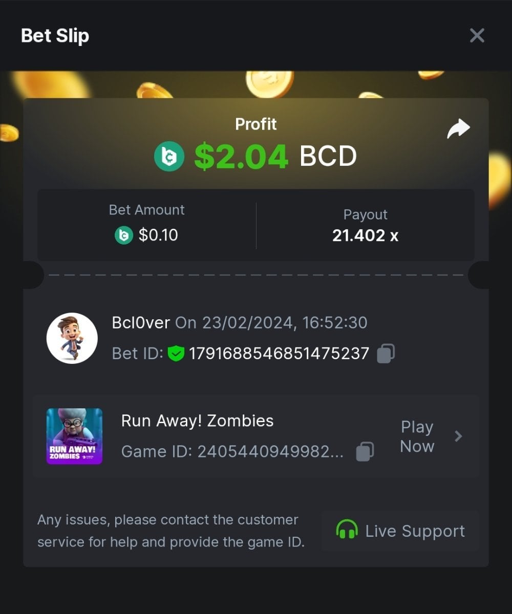 Admin BC_Jack Posted February 23, 2024 Admin Share Posted February 23, 2024 $5,000 BC Originals' New Slots Challenge DURATION: 23rd FEB - 1st MAR, 09:30 am UTC Attention VIPs! Get set for our latest excitement: Dive into the new slot game additions in BC Originals. Gear up for colossal multipliers and seize the opportunity to land hefty payouts with each spin. Join the action now and experience the exhilarating rush of big wins! What's the challenge? Capture a multiplier of 15x or higher on our BC Original slots mentioned below. Make sure you get your multiplier captured in my bets section. In the case of a tie in multipliers, ranking is based on higher average bet amounts (USD). If still tied, the first to post or edit their entry will be prioritized in the ranking. How to Enter To enter, copy the link to the bet you'd like to submit. Once you've copied it, paste it as a reply to this thread like so: Link: https://bc.game/#/sd/11T8H89NPFEOR3 In the same post, upload a screenshot of your win by clicking the game ID WITH VIEW IN USD mode ENABLED (accessible at the bottom of the drop-down menu for your wallet up top). This way, we can ensure that your bet indeed meets the minimum requirement at the time of placing it: Link: https://bc.game/#/sd/11T8H89NPFEOR3 Minimum VIP Minimum VIP 8 with phone verified will be eligible! Minimum Payouts The minimum payout to qualify is 15x Minimum Bet Size Run Away! Zombies: $0.1 Deadliest Sea: $0.1 John Wild: $0.1 Dragon Quest: $0.1 Wizard's Academy: $0.1 Doggy Miner: $0.5 Dragon Slayer: $0.5 Monster Hunter: $0.5 Eligible Coins All cryptocurrencies are eligible (excepting JB) Available Prizes GENERAL TERMS Please combine all of your hits into a single post. Edit your existing post for additional hits; don't create a new post. Each eligible entry must have the Bet Slip URL; failure to include it will disqualify participation in the event. The Bet Slip image is not mandatory. Bets must be posted within 24 hours of placing the bet in order to keep things fair for everyone. Bets must be made during the specified time window stated above. This thread will lock automatically when the time period is over. One (1) entry per household. Anyone found attempting to win multiple prizes will be disqualified from this challenge as well as all future challenges. Failure to follow the instructions will result in your submission being null and void. By entering this challenge, you acknowledge that BC.Game has the final say on results and placement. Payouts will be distributed after the event is finished. Please note that it could take anywhere between 3 to 7 days after the completion of the event. 1 Link to comment Share on other sites More sharing options...