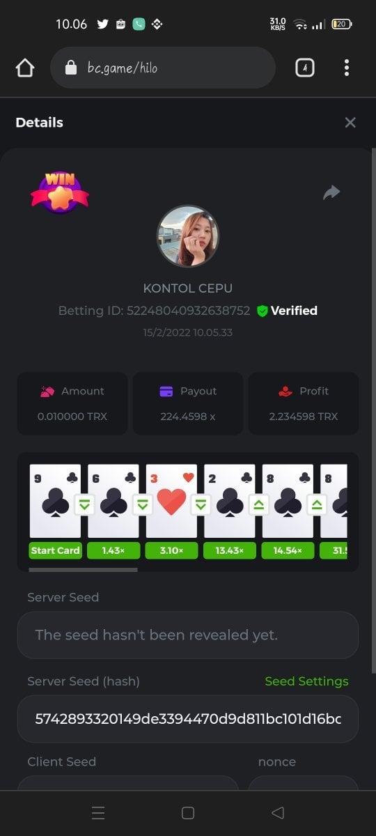 Wiro212sableng Posted February 14, 2022 Share Posted February 14, 2022 King Hilo weekly challenge Periode 11-18 Februari2022 Challenge dengan mencari total Raihan poin tertinggi di game Hilo Peraturan permainan: - Koin bebas selain JB coin Sistem point: Payout 100x atau lebih : 10 point Payout 200x atau lebih : 20 point Payout 300x atau lebih : 30 point Payout 400x atau lebih : 40 point Dan seterusnya payout kelipatan 100 di hitung 1 dan akan dikalikan 10 point. Misal : payout 1455x : 14 x 10 point : 140 point Post username kalian dengan reply post di bawah Post screenshot betid kalian di sini, dan edit post untuk memasukan screenshot bet id selanjutnya User level 3 ke atas no multi account Koin bebas selain bj koin Khusus user Indonesia Post screenshot betidnya di forum Bet berlaku mulai tgl 15 Februari 2022 jam 06.05 am dan max post 24 jam dari semenjak bet di buat. Challenge berakhir Jumat, 18 Februari pukul 19.00 pm Hadiah: 1. 12 bcd shitlink 2. 8 bcd shitlink 3. 5 bcd shitlink 4-10. @2 bcd shitlink 10-15 @1 bcd shitlink Keputusan juri tidak dapat di ganggu gugat Link to comment Share on other sites More sharing options...